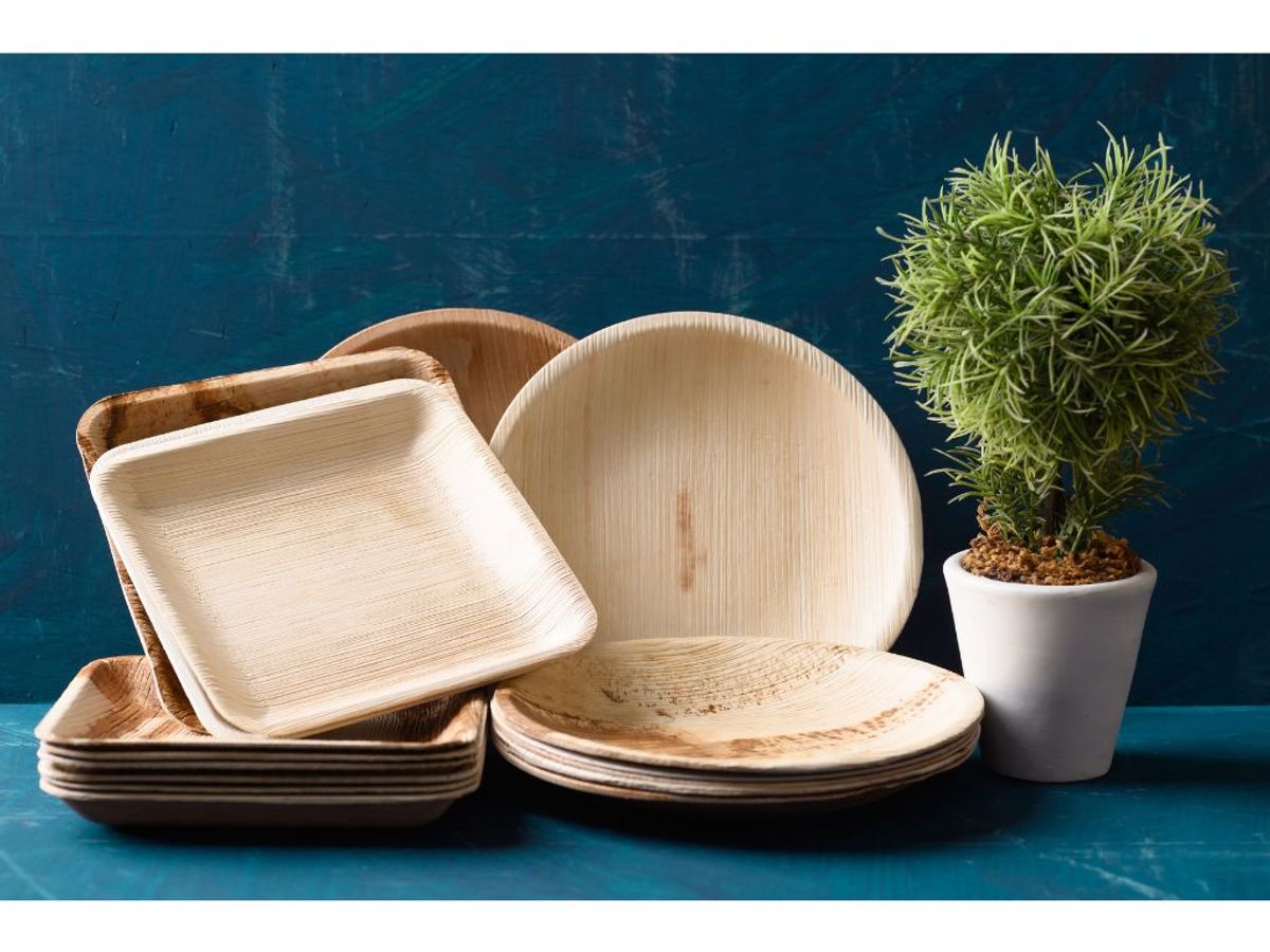 Palm leaf plates are sturdy and can hold both solid and liquid foods for up to 2 hours. They are biodegradable, decomposing naturally within 8 weeks. Plus, they come in over 50 different shapes and sizes, including sets with cutlery.